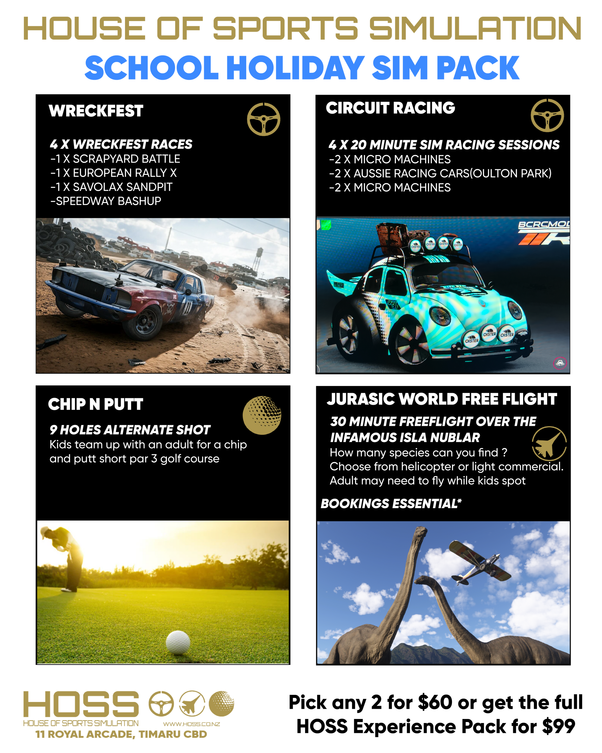 School holidays are here — and we’ve put together something special for kids and parents at HOSS – House of Sports Simulation in Timaru.